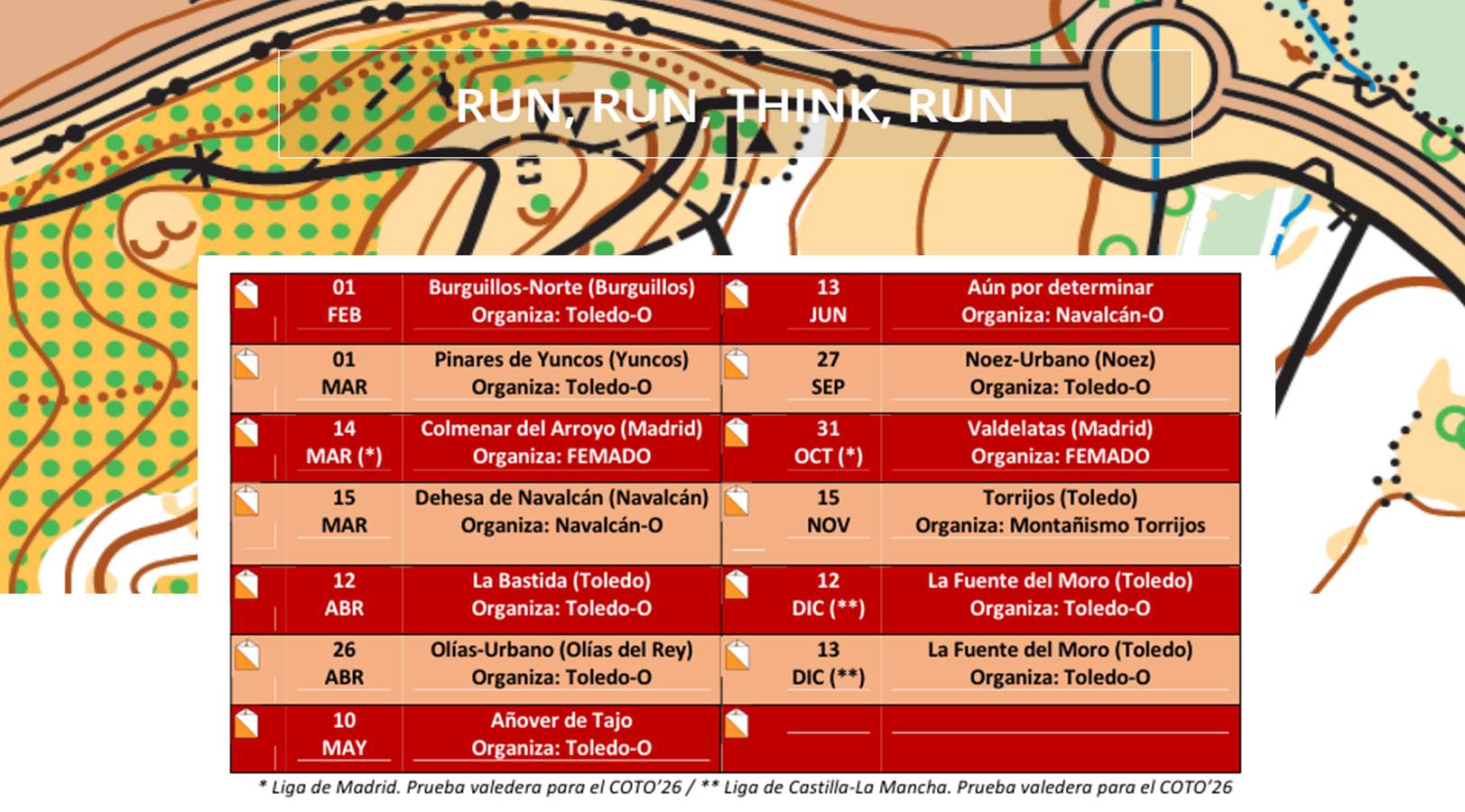 La organización técnica recae en el CD. Deporte Integral - Toledo Orientación, en el CD. Navalcán Orientación y el CD. Montañismo Torrijos, así como en todos aquellos clubes de las localidades donde se celebren competiciones que así lo soliciten, aceptando cada organizador el compromiso del cumplimiento del Reglamento de Orientación vigente y las normas técnico-administrativas aprobadas para la temporada 2026 por la FEDO (Federación Española de Orientación) y la FECAMADO (Federación Castellano-Manchega del Deporte de Orientación).